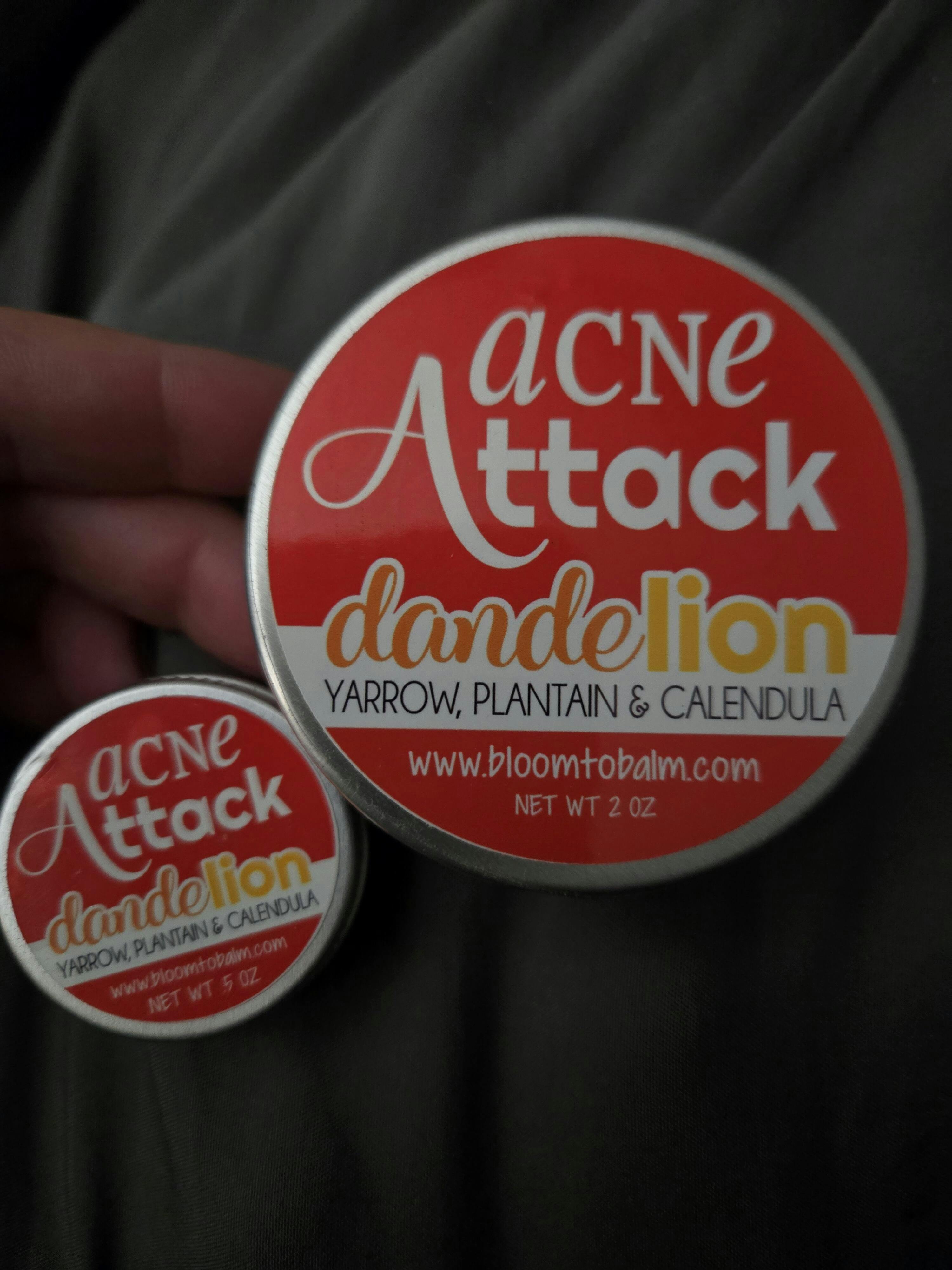 The Acne Attack dandelion salve has been a game changer for my face...my acne is vanishing before my eyes! Its been less than a week and I am seeing noticeable changes to my face...and I haven't even gotten the oil cleanser yet. This it is coming from an acne sufferer for most of my adult life. Get this, you won't regret it! You are a literal God send, this is 100% Holy Spirit ordained and explicitly what he meant by witty inventions... im so happy about these products, Thank you so much!!!!